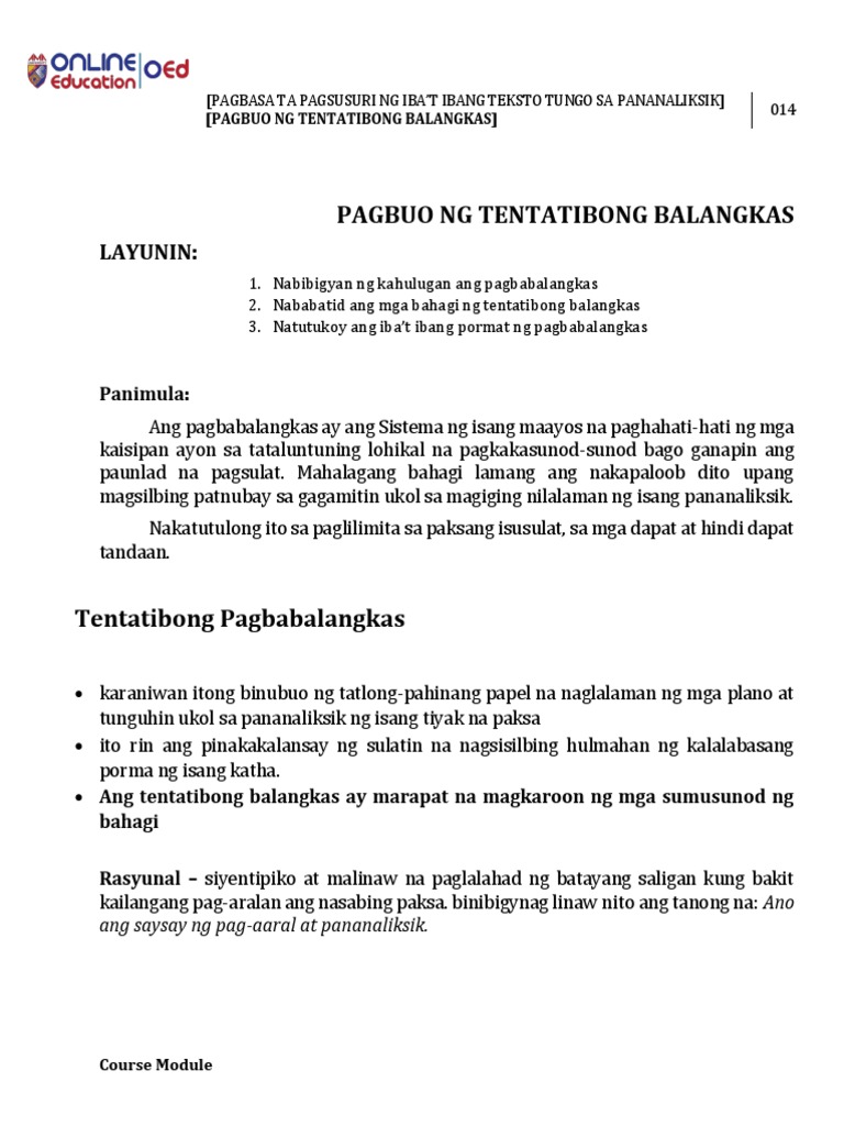 Lesson 15 Pagsulat Ng Tentatibong Balangkas Pdf
