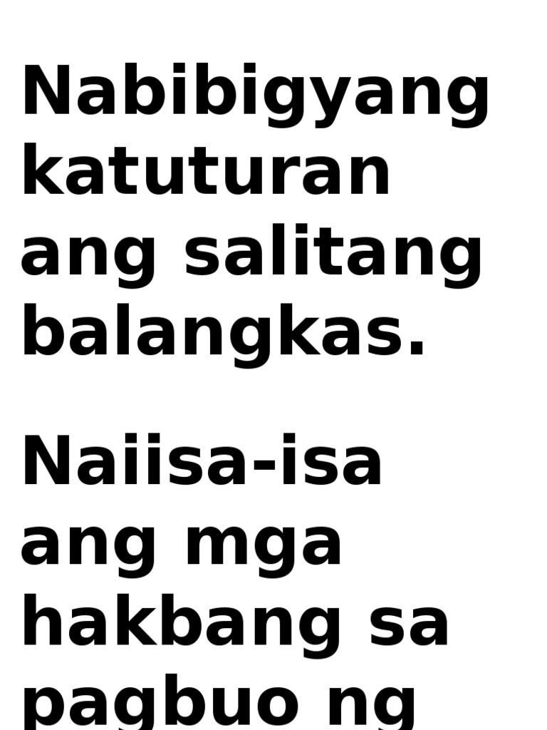 Ang pagbabalangkas ay ang Sistema ng isang maayos na paghahati-hati ng mga kaisipan ayon sa tataluntuning lohikal na pagkakasunod-sunod bago ganapin ang paunlad na pagsulat. Pagaayos ng Abstrak sa Tentatibong Balangkas. Learn vocabulary terms and more with flashcards games and other study tools.