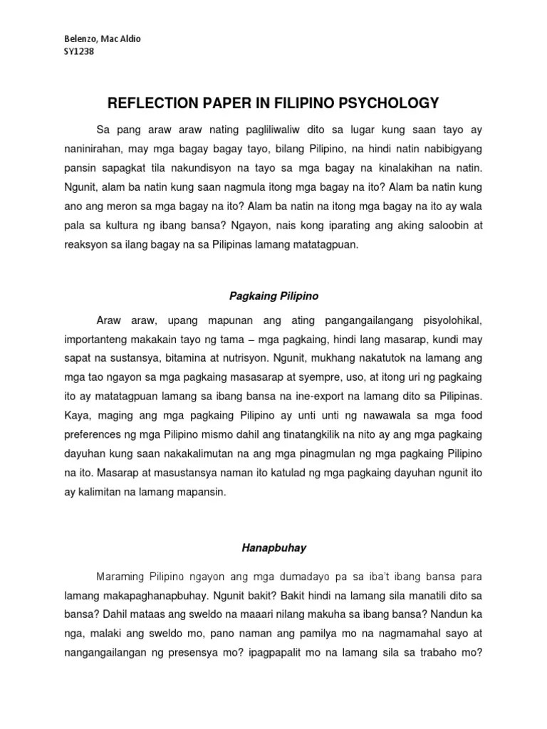 Sitwasyon at Aplikasyon at Gawain 9. Nalaman ko sa sarili ko na di purket akoy isang Pilipino madali na. Ang Repleksyong Papel o reflection paper tinatawag ding reflective paper o contemplative paper ay isang pasulat na presentasyon ng kritikal na repleksyon o pagmumuni-muni tungkol sa isang tiyak na paksa Ang Repleksyong papel ay hindi dayari o dyornal.