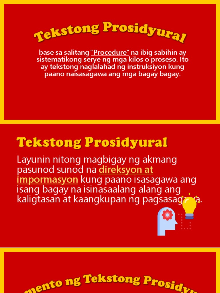 Mga Halimbawa Ng Tekstong Prosidyural. Nagpapaliwanag ito kung paano ginagawa ang isang bagay. Inilalahad nito ang serye o mga hakbang sa pagbuo ng isang gawain upang matamo ang inaasahan.