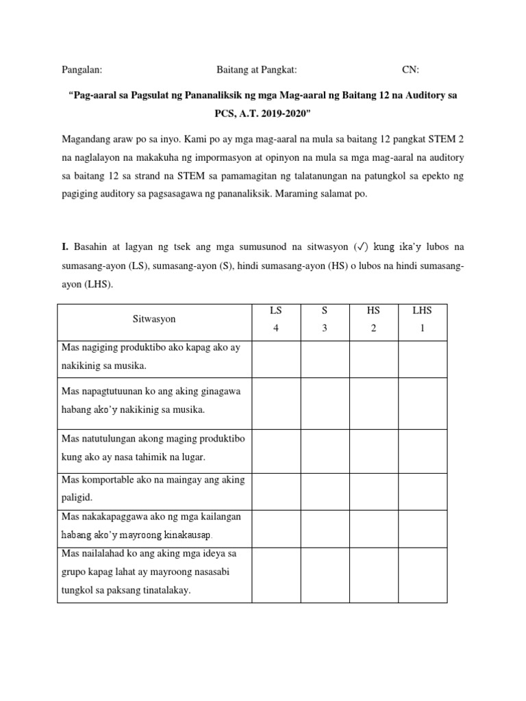 0 ratings 0 found this document useful 0 votes 198 views 40 pages. Limitasyon ng paksa C. KASANAYAN NG MGA MAG- AARAL SA PAGSASALIN NG MGA TALATANUNGAN QUESTIONNAIRE PARA SA PANANALIKSIK Nina Rodelio C.