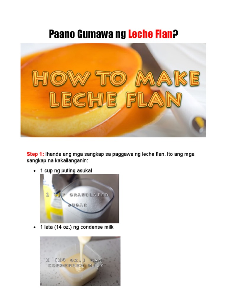 Mga Hakbang sa Pag gawa ng Leche Flan. Sundin ang mga sumusunod na mga hakbang. Paibabawan ng hiwa-hiwang murang sibuyas o green.