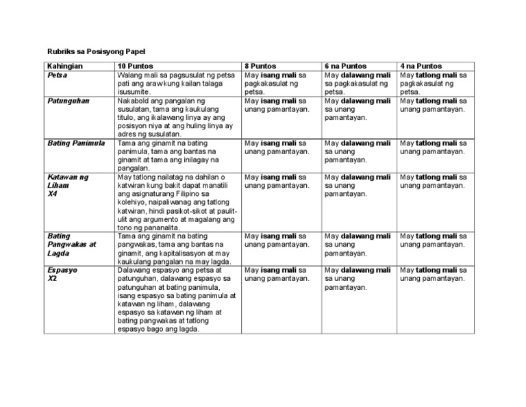 Rubriks Sa Posisyong Papel Pdf