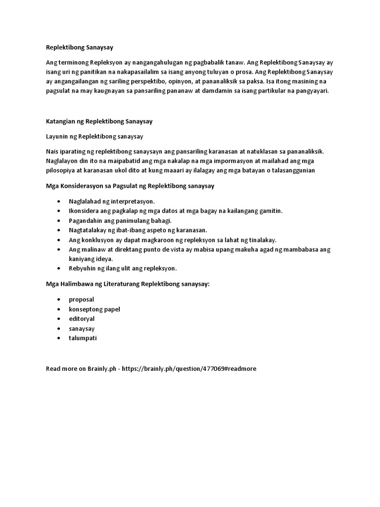 REPLEKTIBO O REPLEKSYON Pagbabalik tanaw at pagsusuri sa mga pangyayari batay sa personal na karanasan Pag-iisip ng mga naging epekto sa sarili ng. Kaiba sa pagsulat ng talambuhay na tumatalakay sa buhay ng isang tao ang pagsulat ng replektibong sanaysay ay naglalayong bigyang-katwiran ipaliwanag o SUriin ang partikular na salaysay at palutangin ang halaga nito o ang maidudulot nito depende sa layon ng manunulat sa buhay ng tao at sa lipunan Arrogante Golla Honor-Ballena 2010. Ay tinatawag ding repleksyong papelItoy pasulat na presentasyon ng kritikal na repleksyon o pagmumuni-muni tungkol sa isang tiyak na paksa.