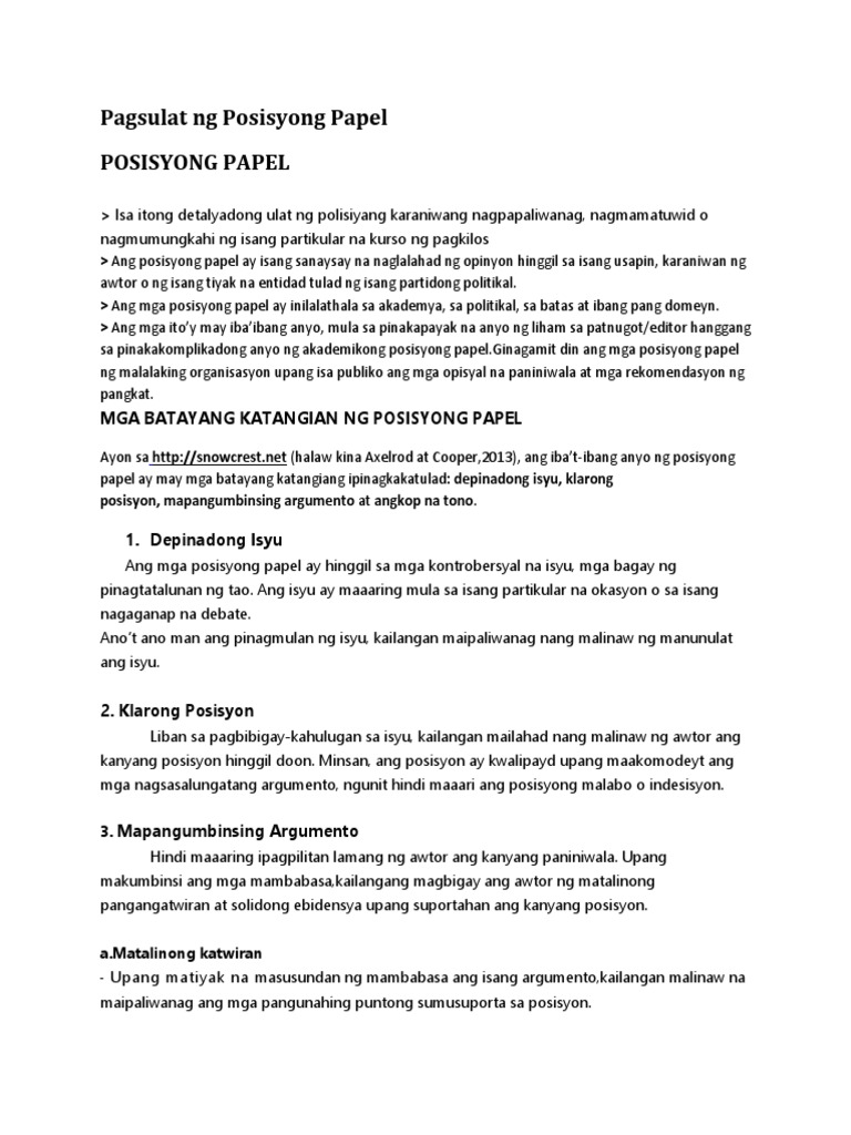 Ano ang posisyong papel Posisyong Papel posisyong papel halimbawa posisyong papel kahulugan. PAGSULAT TUNGO SA PAGBABAGO. Maaring ang paksa ay maging simple o komplikado ngunit ang iyong gagawing argumento o pahayag ng tesis ay mahalagang maging matibay malinaw at lohikal.