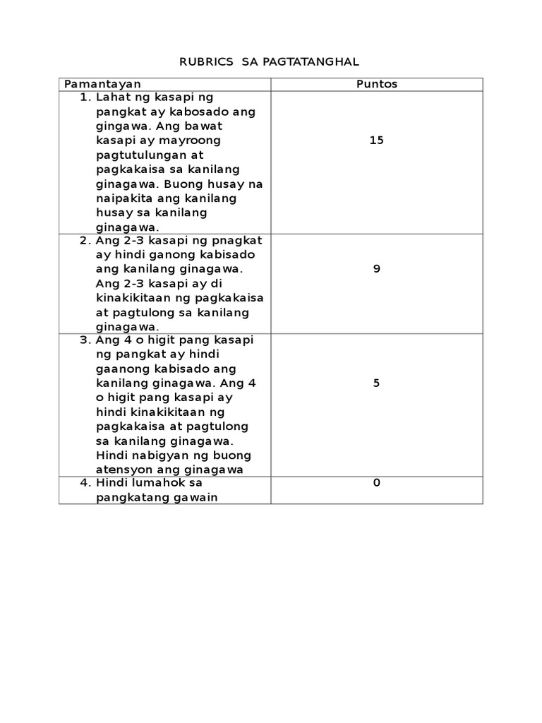 RUBRICS sa pagsasagawa ng Pangkatan Gawain Puntos Kasanayan 5 Natutukoy naipapaliwanag at nagagamit nang may kawilihan ang ibat-ibang productivity tools sa pagbuo ng angkop na disenyo 4 Natutukoy at naipapaliwanag ang paggamit productivity tools sa pagbuo ng angkop na disenyo 3 Natutukoy at naipapaliwanag ang ibat ibang uri ng productivity tools 2 Natutukoy at. Rubrics sa Filipino - Paggawa ng Diyalogo Puntos57Pamantayan1. Walang kaisahan ang mga pangyayaring inilahad sa.