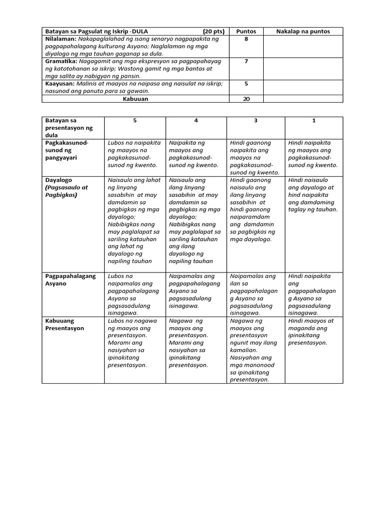Rubrics para sa Pagsulat ng Iskrip sa Dula-dulaan Criteria Katangi-tangi 20 Kapuri-puri 15 Katangap-tangap 10 Kailangan pang pagbutihan 5 Mga Nilalaman Naisusulat at naiisa-isa ang kaalaman sa pagsulat ng iskrip sa dula-dulaan Nailalahad ngunit hindi naiisa-isa ang kaalaman sa pagsulat ng iskrip sa dula-dulaan Kulang ang ideya sa pagsulat ng. Rubrik sa Pagsulat ng Iskrip at Diyalogo Mga Pamatayan Napakahusay Mahusay 5 puntos 14 puntos Katamtamang Husay 3 puntos A.