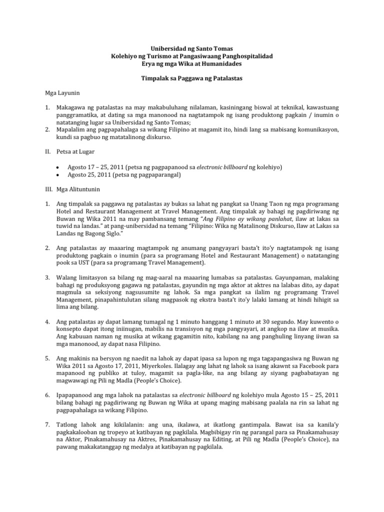 Matapat at mahusay na nailahad ang impormasyon. Ang timpalak sa paggawa ng patalastas ay bukas sa lahat ng pangkat sa Unang Taon ng mga programang Hotel and Restaurant Management at Travel Management. FIL7 - MODYUL 1.