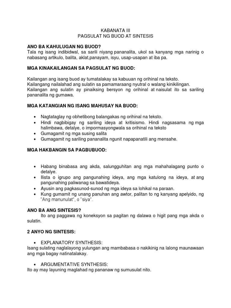 Ang layunin nito ay maka kuha ng importante ngunit maikling sulatin na kumakatawan sa kabuan ng kanyang ibinuod. Ilista ang mga sanggunian 7. Sa madaling pagpapaliwanag ang sintesis ay ang pagsasama-sama ng mga impormasyon mahahalagang punto at ideya upang mabuod ang napakahabang libro mabuo ang isang bagong kaalaman at maipasa ang.