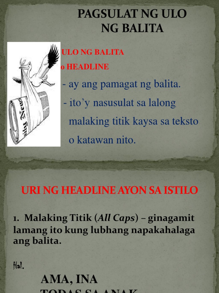 Ipinagkibit-balikat ni Presidente Gloria Macapagal Arr oyo kahapon ang balitang di-umanoy pagtatangkang pagpatay sa kanya sa pagsasabing tinakdaan na ng Diyos ang haba ng buhay ng bawat tao sa ibabaw ng l upa sa pamamagitan ng. Isang pangungusap lamang ang dapat gamitin sa headline at dapat itong ipaliwanag ang paksa ng balita sa isang malinaw at maigsi na paraan. PAGSULAT NG ULO NG BALITA RENE BENDAL SUNDAY 7 JANUARY 2018 Katuturan ng Ulo ng Balita Ang ulo ng balita ay ang pamagat ng isang balita na nagtataglay ng lalong malaking titik kaysa teksto o katawan nito.